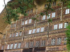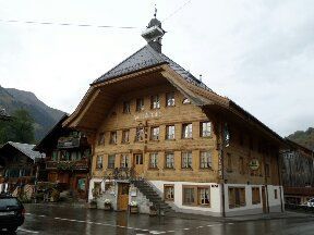 Ses dimensions s'expliquent par sa destination première de cave à fromages, tout en bois pour l'entreposage et la commercialisation de 600 meules. Le soubassement maçonné est l'œuvre de Gabriel Massar, la charpente de Joseph Genayne de Château d'Oex, et les frises et les décorations peintes sont de Jean Raynaud et de son épouse Marie Perronet, de Château d'Oex. De facture artisanale locale à clavins, il est surtout caractéristique par sa taille (113 fenêtres pour 60 pièces dont 40 chambres habitables, 27 mètres de façade sur 5 étages, 20 mètres au faîte, 15 mètres de profondeur) et son toit pentu (200 m2) à réveillonnage et pans brisés. Il a nécessité 750 m3 de bois en grume, soit plus de 200 épicéas, et 950 m2 de tavillons pour la couverture soit 70 épicéas de plus, pour un ensemble de près de 1 000 m3 coupés dans les forêts du propriétaire. De nombreuses inscriptions figurent sur la façade avant. Elles comportent 2 800caractères composées par David Henchoz lui-même, qui y exprime ses convictions chrétiennes personnelles. Il y mêle également des phrases tirées des œuvres d'Antoinette Des Houlières, poétesse contemporaine.